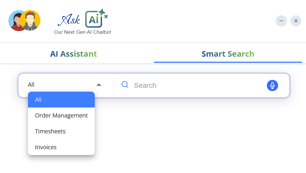 (Microphone) icon. Selecting any search result will directly navigate you to the respective order, timesheet or invoice record.
