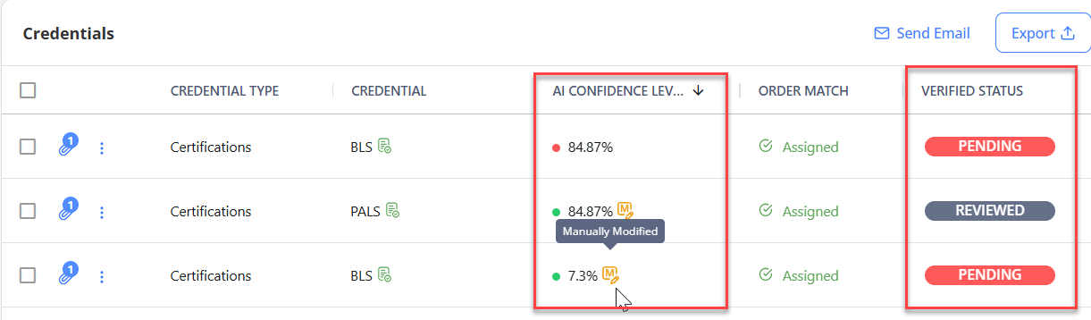 A green dot indicates trusted credentials (confidence meets or exceeds the threshold), while a red dot indicates those needs manual review (See the imageSee the image). Manual Modified or credentials falling below the threshold require manual review.
